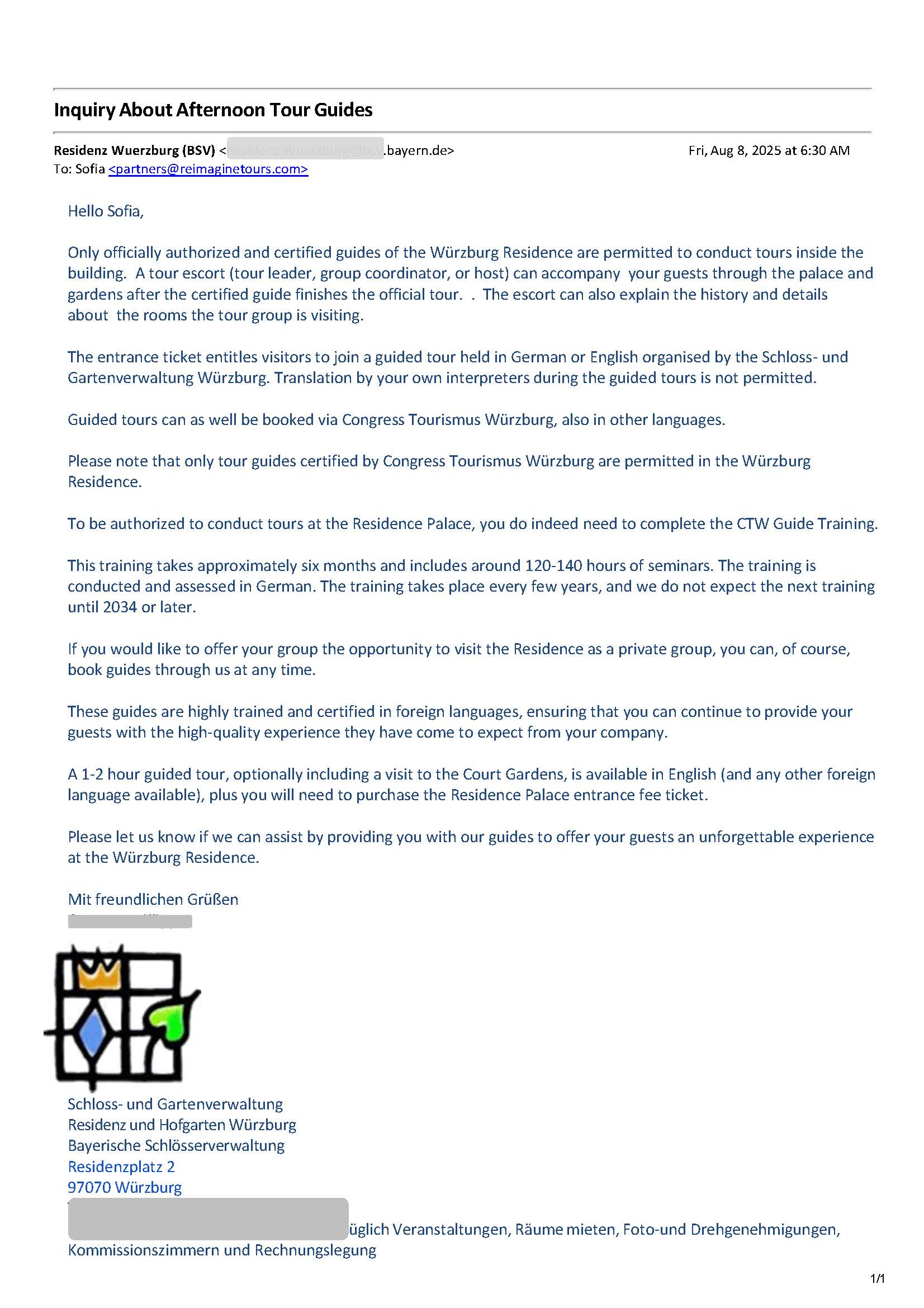 Clarification on the information provided on the official website of the Würzburg Residence regarding guided tours.